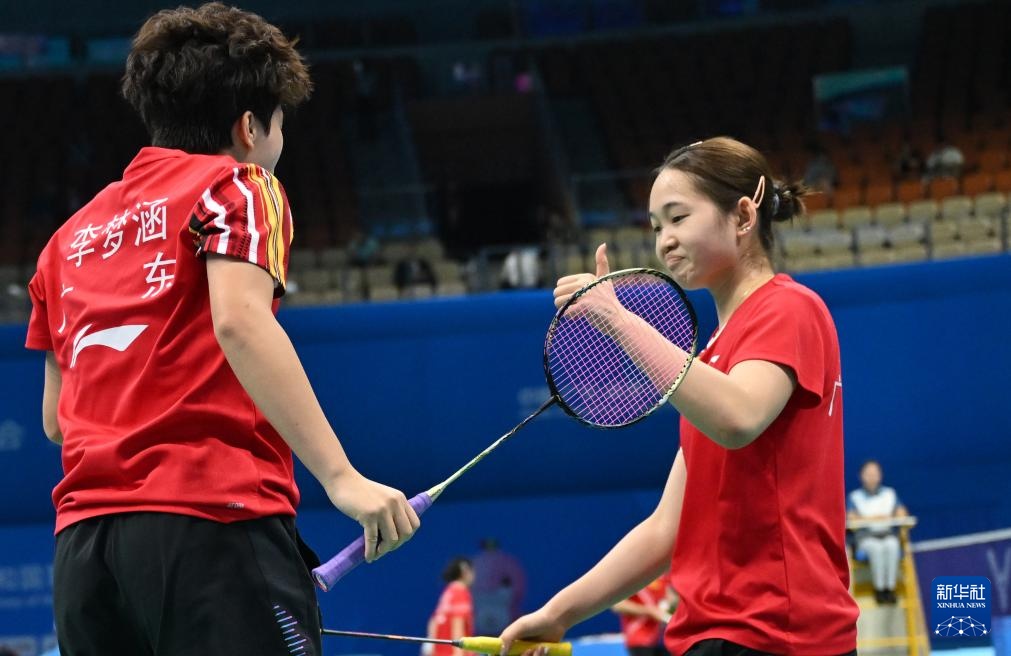 11月10日,广东队组合李梦涵/黄可欣(右)参加女双比赛。他们以2-0击败上海队石旭睿/邵佳妮。...